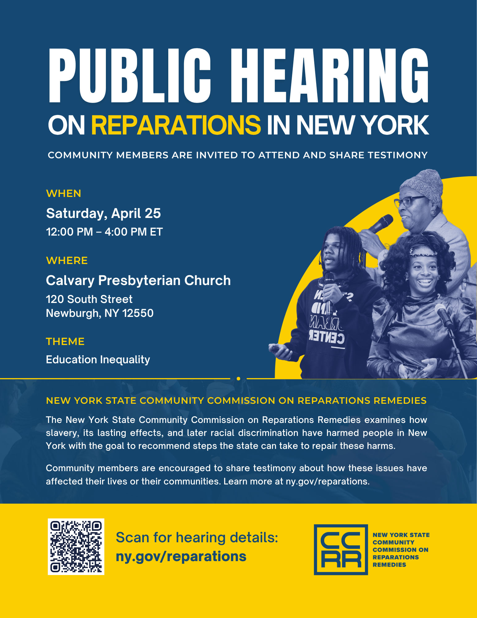 NEWBURGH, NY, UNITED STATES, April 16, 2026 /EINPresswire.com/ -- The New York State Community Commission on Reparations Remedies (NYSCCRR) will hold a public hearing on Saturday, April 25, 2026, from 12:00 p.m. to 4:00 p.m., focused on education inequality. The hearing is open to the public and will provide an opportunity to gather testimony, research, and community input to inform the Commission’s ongoing work advancing reparative justice across New York State.